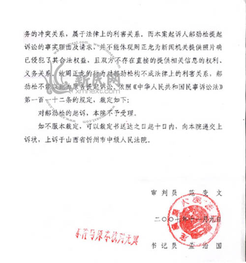 新民網(wǎng)從郝勁松提供的《山西省定襄縣人民法院民事裁定書》照片了解到,定襄法院不予受理的理由是:起訴人郝勁松提起訴訟的事實(shí)理由及請求,并不能體現(xiàn)周正龍為新聞機(jī)關(guān)提供照片確已侵犯了其合法權(quán)益,且雙方不存在直接的提供相關(guān)信息的權(quán)利、義務(wù)關(guān)系。故周正龍的行為對郝勁松構(gòu)不成法律上的利害關(guān)系,郝勁松不能以此為原告提起訴訟。