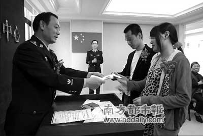 在得知女友懷上了孖仔后,為了給即將出生的兩個寶寶一個合法的身份,中山市看守所內(nèi)的服刑人員袁某提出要與女友結(jié)婚?词厮L證婚,婚禮現(xiàn)場的布置由看守所的民警一手張羅。11月21日,袁某與女友如愿在中山市婚姻登記中心登記成為合法夫妻,成為中山市首個登記結(jié)婚的服刑人員。