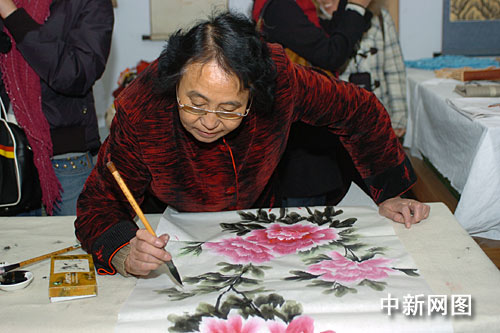 中新網(wǎng)11月28日電 今天下午,“第五屆網(wǎng)上河北行(邯鄲)”網(wǎng)絡(luò)媒體采風(fēng)團(tuán)來到邯鄲市邯山區(qū)渚河路街農(nóng)林二社區(qū)居民中心參觀。在才藝展示廳內(nèi),展柜上一件件精美小巧的自制手工藝品吸引了眾人的目光,紛紛向制作者請教制作過程。而一幅正在繪畫當(dāng)中的牡丹圖,嬌艷欲滴,記者紛紛拍照留念。