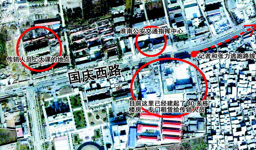 張力簡單地介紹了情況:一個龐大的非法傳銷組織,此地大約40棟房屋內租住有近5000人,打著“天津天獅生物發(fā)展公司”的旗號,推銷的是一種賺錢的方法,新人入會交納2800元,采用非法傳銷通用的五級晉升制度。新人剛來無論干什么都會有人陪同,寸步不離,包括上廁所和洗澡。