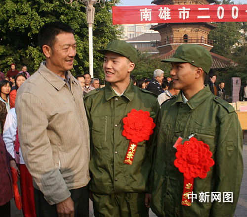 中新網(wǎng)韶關(guān)12月4日電(馮昶 李凌 朱祖純 李子亮)12月4日,粵北革命老區(qū)南雄市三影塔廣場人群涌動,紅花簇簇,一派喜氣洋洋的熱鬧場面,當(dāng)?shù)卣谶@里舉行隆重的進(jìn)藏新兵交接儀式。家住南雄市鄧坊鎮(zhèn)洋西村的一對畬族同胞兄弟藍(lán)旭東、藍(lán)善斌雙雙踏上了進(jìn)藏當(dāng)兵的旅程。