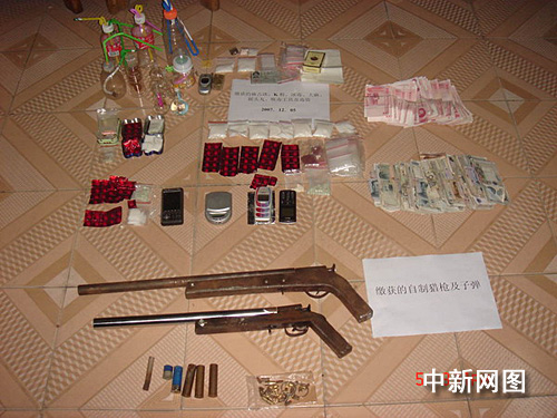 中新網(wǎng)韶關(guān)12月7日電(馮昶 陳文明 張黛虹)廣東韶關(guān)樂昌市警方今天稱,警方在日前開展的代號為“搜狐”的緝毒行動中,成功抓獲了販毒犯罪嫌疑人6名,當(dāng)場繳獲自制獵槍2支,子彈4發(fā),搖頭丸、冰毒等一大批毒品,以及毒資人民幣5000多元。至此,一個在樂昌市區(qū)娛樂場所販賣毒品的特大涉槍販毒團伙被警方成功摧毀。