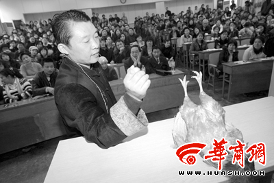 “貓最怕什么?”“老鼠”!這不是在玩腦筋急轉(zhuǎn)彎;一名懸空躺下的男子膝蓋上站著一位成年人,這也不是在練硬氣功;眾目睽睽下,通過“交流”,一只正在奮力掙扎的母雞很快安靜下來,這更不是因?yàn)樗苈牰嗽。這是昨日在西安第四軍醫(yī)大學(xué)舉行的一場“自然催眠療法”公益演示會上,聽眾進(jìn)行的一次“催眠之旅”。