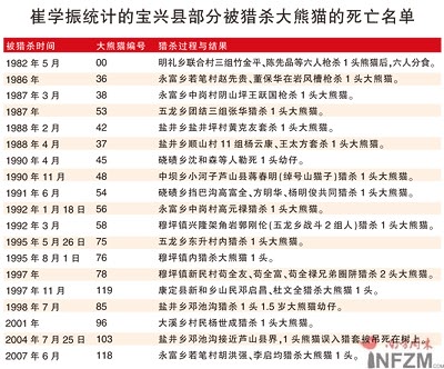 原寶興縣林業(yè)局局長、原四川寶興蜂桶寨國家級自然保護(hù)區(qū)管理局局長、大熊貓專家崔學(xué)振不完全統(tǒng)計(jì),二十年間寶興縣就有20只大熊貓被獵殺。(見附表)