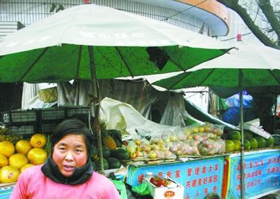 這里的商販全都沒撐傘,除兩個水果攤外,其他服裝攤也沒使用統(tǒng)一車輛。記者問一水果攤商販:“你們怎么沒買市容局的傘?”“買了兩把,天冷了,用不上就放家里了。”一商販說。