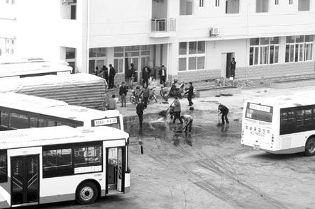 記者在現(xiàn)場附近一高樓上看到,停車場內一角落邊停放著四輛公交車,有的車玻璃已碎裂,車上可明顯看到被火燒過的痕跡。場內幾名工作人員推著板車在運一些烏黑的物體,十個人在幾輛公交車圍起的地方忙著清洗烏黑的地面,旁邊還停著一用塑料布包裹嚴實的物體。場內有人發(fā)現(xiàn)記者在拍攝,又叫來一部公交車將清洗的地方圍起來。