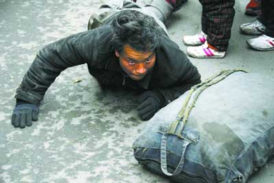 一民工在鄭州街上爬行,給吃的他不要,給錢他也不要。他說“我出來打工,是靠自己的雙手掙錢”。
