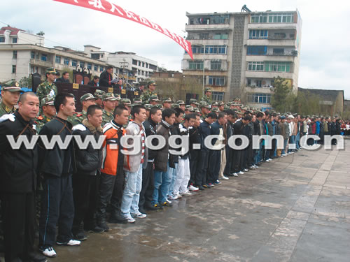 據(jù)了解,這是建國以來安順第一起涉黑案,屬公安部、最高檢和最高法院掛牌督辦的案件。昨日下午2時10分,數(shù)十名全副武裝的武警戰(zhàn)士將50名雙堡幫成員押進會場。數(shù)千市民自發(fā)趕到若飛廣場,參加了宣判大會。