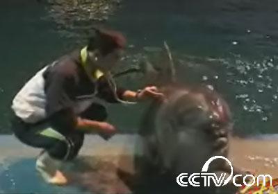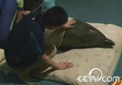 山東蓬萊海洋極地世界海豚館獸醫(yī)張建榮說,它游泳的姿勢(shì)發(fā)生了改變,仰泳 肚皮朝上,而且在池底吧,趴在池底不斷地摩肚子。