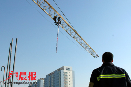 昨日上午9時(shí)30分, 在新城區(qū)新華大街富邦商務(wù)中心建筑工地上,兩名河南籍農(nóng)民工爬到距地面50米的吊臂上,欲追討欠薪。他們說施工方拖欠他們十幾萬元工錢。事發(fā)后,民警及時(shí)趕到現(xiàn)場(chǎng),緊急聯(lián)系工程負(fù)責(zé)人。與此同時(shí),呼市勞動(dòng)部門也介入調(diào)查處理。4個(gè)小時(shí)后,這兩名農(nóng)民工才從塔吊上下來。