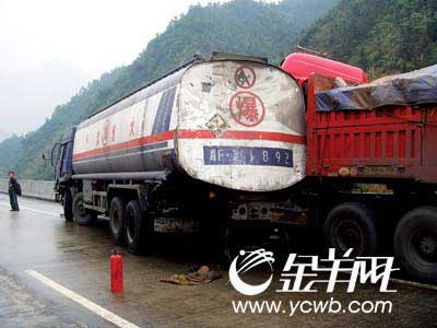 上午11時許,記者在事故現(xiàn)場看到,一處高架橋面遺留下許多車輛機(jī)件碎片和污跡,地面上有大量油狀液體,空氣中彌漫著一股難聞的化學(xué)品氣味;一輛滿載石料的湘C號牌紅色牽引半掛車和一輛湘F號牌的白色罐體化學(xué)品運輸車緊緊地粘在一起,半掛車的駕駛室被擠壓得嚴(yán)重變形。另一輛事故車是掛湘B號牌的藍(lán)色大貨車,駕駛室遭撞擊嚴(yán)重受損,車身已呈180度掉頭,從其鐵皮車廂的幾處巨大裂口可以看到車廂內(nèi)滿載煙花爆竹。