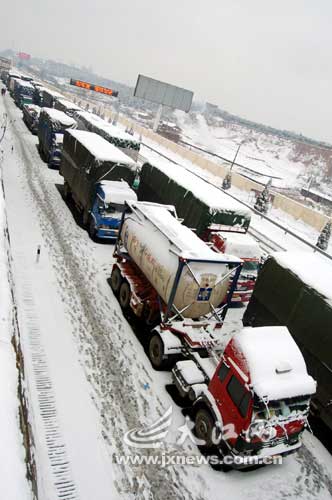 1月15日早上,記者趕往九江長江大橋,只見各種車輛在高速公路上排起長龍,一直延伸到沙河段。武警九江支隊(duì)直屬大隊(duì)謝隊(duì)長告訴記者,14日早上,該大隊(duì)派出了100多名武警官兵,并拉來100多車砂石鋪在橋面上。在交警的指揮下,200余輛車緩緩?fù)ㄟ^。但由于14日晚10點(diǎn)左右雪越下越大,橋面又開始結(jié)冰,15日凌晨1時左右,交警再次封橋,上萬輛車堵塞在昌九高速公路上及九江市區(qū)邊緣。