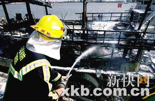 一名消防員指著船尾兩個被埋在木炭堆中的煤氣瓶說:“據(jù)船員說,船上本來有3個煤氣瓶,其中兩個剛加滿氣,另一個是空的,起火后有一個爆炸了。一名船員當時在船頭位置,發(fā)現(xiàn)起火后就把纜繩解開了。后來他發(fā)現(xiàn)自己的手機放在駕駛艙,就闖進去想拿出來報警,沒想到手機被燒壞了!