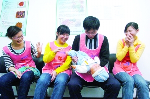男孩也要接受育嬰訓(xùn)練。22歲的小武(化名)是個(gè)靦腆的男生,畢業(yè)于四川某大學(xué)計(jì)算機(jī)專業(yè),“小武,你孩子抱倒了!薄靶∥,包子不是這么包的,你包的是燒麥吧!边@個(gè)“川哥哥”對(duì)未來的工作顯然還不夠熟練。