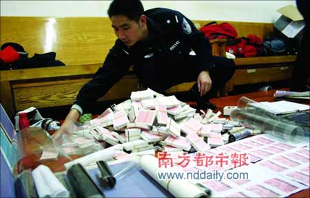 隨后,偵查員將小轎車車主吳某押至其租住的浪尾村出租屋。民警沖進(jìn)房間,將正在房間內(nèi)整理假票的吳某妻子抓獲,當(dāng)場繳獲成品假火車票3張和半成品假火車票3萬張,以及制造假火車票的專業(yè)印刷排版工具一批。偵查員在抓獲主要犯罪嫌疑人的同時(shí),另一路專案組偵查員也同時(shí)直撲藥店,一舉將正在該藥店進(jìn)行假票銷售交易的嫌疑人尹某和廖某當(dāng)場抓獲,在該藥店火車票代售點(diǎn),警方搜出了大量用于訂票所用的單據(jù)和憑證。