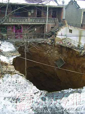 一個(gè)深20多米、直徑20多米的洞口,赫然就在村路上。洞口的民房,大門圍墻和廚房還有樓梯間都沒(méi)了,只留下東面一面墻!爱(dāng)時(shí)我們還以為是地震呢!贝罂幽厦娴拿穹侩m未受損,但住路北的王女士提起這件事仍心有余悸。王女士說(shuō),21日天黑時(shí),就聽(tīng)到有響動(dòng),聲音像刮大風(fēng)。再后來(lái),房子的窗戶玻璃一會(huì)兒一抖,家里的燈泡也開(kāi)始晃!耙灿洸磺迳稌r(shí)候,就聽(tīng)到一聲悶響,開(kāi)門一看,對(duì)面住的人慌著往外翻墻,有的只穿條秋褲!沒(méi)多大會(huì)兒,剛翻過(guò)的墻就開(kāi)口了,接著塌陷了……”