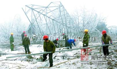 由于受強冷空氣影響,連日來,昭通大部分地區(qū)持續(xù)普降凍雨、大雪,致使昭通電網(wǎng)遭遇10年不遇的覆冰自然災害,造成昭通大面積停電,并嚴重威脅著內(nèi)昆線鐵路運行和溪洛渡電站施工用電。目前,威信、鎮(zhèn)雄、鹽津3縣已經(jīng)與云南電網(wǎng)脫離,孤網(wǎng)運行;鹽津紅原電石廠、水富金明化工廠已被迫停產(chǎn)。