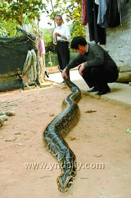 可最終,鄰居要走的7條小蟒蛇都先后死了,只有自己留下的兩條一直養(yǎng)到了兩公斤重。楊建松回憶說,當時他在生產(chǎn)隊當聯(lián)防隊員,每天除了下班后飼養(yǎng)兩條小蟒蛇外,上班時他也一直帶在身上,有空就拿出來玩耍。在1995年的一天,他帶著兩條已經(jīng)有50多厘米長的小蟒蛇出去玩時,一個親戚看見他衣服口袋里裝著什么東西撐得鼓鼓的,就將手伸進他的口袋想掏出來看個究竟。誰知伸進口袋一抓,就抓住了口袋中的小蟒蛇,拿出來一看,嚇得驚慌失措的這位親戚慌忙一下子就將手中的小蟒蛇摔在地上,結(jié)果這條小蟒蛇當場被摔死了。