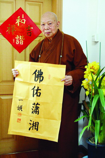 坐在北京廣濟(jì)寺中國(guó)佛教協(xié)會(huì)辦公室里,全國(guó)政協(xié)常委、中國(guó)佛教協(xié)會(huì)會(huì)長(zhǎng)一誠(chéng)大和尚不禁面露愁云,為家鄉(xiāng)湖南遭遇雪災(zāi)而擔(dān)憂著。80高壽的一誠(chéng)大和尚用稍微有點(diǎn)顫抖的手提起了筆,飽含深情地寫(xiě)下了“佛佑瀟湘”四個(gè)大字,“祈愿家鄉(xiāng)湖南能永離災(zāi)難,人們幸福安康”。為此他還準(zhǔn)備為家鄉(xiāng)捐出5萬(wàn)元。