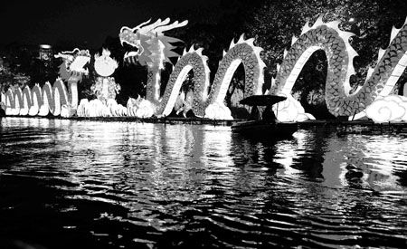 沿著北秀湖走去,湖面上長(zhǎng)達(dá)90米的二龍戲珠巨型花燈騰空躍起于湖面之上,龍頭和金珠子不停擺動(dòng),湖面波光粼粼,相互映襯之間,有游客蕩舟于湖面之上,此情此景別有一番韻味。沿岸小路的另一邊,擺放了一排反映老廣州風(fēng)情風(fēng)貌的花燈,一路看去十分有趣。(記者 孫雯 通訊員 張燕鵬 陳曉敏)