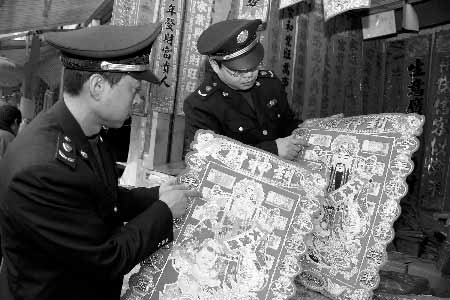 執(zhí)法人員立即讓該店停止銷售行為,質(zhì)問其是否知道把人民幣圖樣印在年畫上是違法行為時,店家連說不知道,說年畫上印上人民幣就圖個吉利。在隨后的檢查中,執(zhí)法人員發(fā)現(xiàn)許多年畫上都印有人民幣圖樣,而店家卻無一知曉這是違法行為!拔覀冎皇怯X得吸引客人,大家都圖個財源滾滾,真不知道這是違法的。”一家年畫店的張姓老板說。