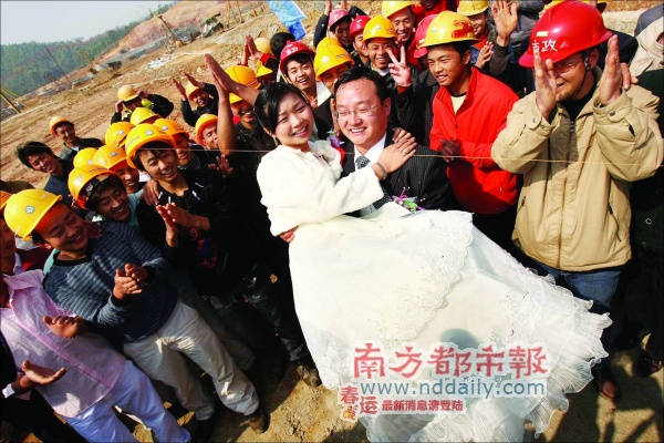 高輝和現(xiàn)在南山外國語學(xué)校擔(dān)任音樂老師的妻子黃莉琴都是江西人,本來已經(jīng)和家里人說好,今年春節(jié)回家鄉(xiāng)舉行兩人的婚禮,但是自從去年8月開始,高輝所有的節(jié)假日和雙休日都被工地上忙碌的工作占滿了。因為實在抽不出時間回老家舉辦婚禮,在征得了妻子的理解和同意后,小兩口最后決定在大運會施工現(xiàn)場舉行自己的婚禮。