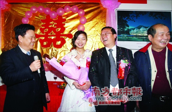 昨日的深圳大運會指揮中心,面積不大的辦公大廳,被貼上了“喜”字,掛上了彩帶,布置成了一個簡單卻充滿了溫馨和喜氣的婚禮“禮堂”。在《婚禮進行曲》中,身著白色婚紗手捧花束的新娘,挽著文質(zhì)彬彬的新郎走進“禮堂”,而他們的同事則穿上了傳統(tǒng)的對襟中式服裝,當(dāng)上了“兼職”司儀。