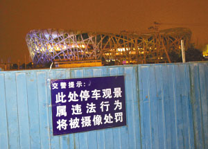 “此處停車觀景屬違法行為,將被攝像處罰”。隨著奧運會的日漸臨近,“鳥巢”、“水立方”逐漸成為了奧運熱門景點,北辰橋上每天有眾多游客停車拍照。為此,交管部門在橋上設立交通警示牌,告誡司機停車拍照將受處罰。