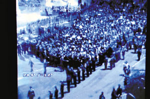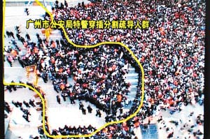 鏡頭:如同鐵板一塊的人群中,數(shù)支深色“箭頭”直插進(jìn)去。這些都是廣州特警,他們手拉手,傾力擠進(jìn)人群,十幾分鐘后,神奇般出現(xiàn)了一塊塊空地。