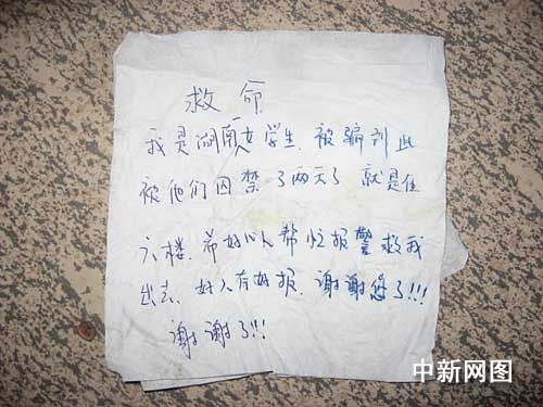 這天下午,一位熱心的中年婦女把發(fā)現(xiàn)字條的情況告訴了正在此地巡邏的民警,并把民警帶到樓下。民警見(jiàn)字條上面寫(xiě)著“救命,我是湖南一女學(xué)生,被騙到此被他們囚禁了兩天了,就在六樓,希望好心人幫忙報(bào)警救我出去,好人有好報(bào)、謝謝您了!!”。
