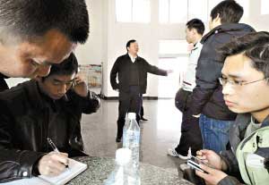 、谧蛉丈衔纾诰沤械掳部h公安局,該局雷政委(中)正在與當(dāng)?shù)匦叹、志愿者和本?bào)記者一起布置行動(dòng)方案。
