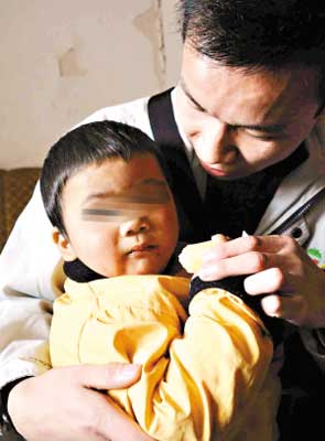 放好摩托車后,劉大毛便四處張望。當(dāng)他看到注視著他的記者一行時(shí),馬上拖起男孩子的手,笑嘻嘻地迎了上前。沒(méi)等仔仔介紹完隨行兩人的關(guān)系,女記者便已經(jīng)彎下身去逗小男孩。可是當(dāng)她準(zhǔn)備抱他時(shí),孩子馬上大哭起來(lái),轉(zhuǎn)過(guò)身去,雙手緊緊地抱著劉大毛的右腿不放。在劉大毛的幫忙下,女記者才勉強(qiáng)抱起了男孩,但他依然哭個(gè)不停。