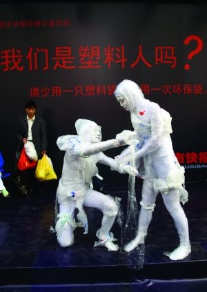 兩個(gè)被塑料袋緊緊包裹、渾身慘白的人,舉步艱難,倒在地上痛苦地掙扎;其他幾個(gè)外表正常的人,也不由自主地受到塑料袋的束縛,逐漸喪失行動(dòng)能力……昨天下午,在杭州東新園沃爾瑪超市門外的廣場上,一場由本報(bào)發(fā)起、杭州環(huán)保志愿者一起參與的、以“我們是塑料人嗎”為主題的現(xiàn)場行為藝術(shù),牢牢抓住了過往行人的眼球,他們圍了個(gè)里三層外三層,看清楚之后,發(fā)出這樣的驚嘆,“哦,原來是這樣的!”