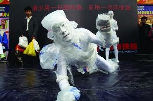 行為藝術(shù)不僅帶來了視覺沖擊,還引人思考。從今年6月1日起,國家將限制在超市、商場、農(nóng)貿(mào)市場等場所免費(fèi)提供塑料袋,提倡使用環(huán)保袋。很多在場觀看的觀眾,已經(jīng)對此有所了解。一位大伯輕聲地念出活動(dòng)背景板的橙色大字:“少用一只塑料袋,多用一次環(huán)保袋”,而后他說,塑料袋這個(gè)東西,多用總歸是不好的,這個(gè)道理我們是知道的,可是大家都想圖個(gè)方便,少用做不到。一位中年婦女對著“塑料人”問:“這樣包起來多不透氣。渴遣皇呛軔?”另一位現(xiàn)場觀眾馬上接口:“就是讓你看了覺得不透氣,這些袋子如果扔到泥土里,泥土就不透氣了哎!”他的分析,馬上引來周圍觀眾的響應(yīng)。