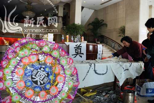 死者的親屬在酒店內(nèi)擺設(shè)的靈堂 包文涵 攝