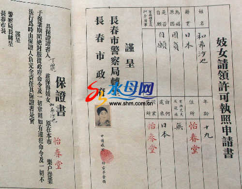 在“許可執(zhí)照申請書”另一頁,是一份保證書,保證書上有鋪保等機構(gòu)和個人的擔(dān)保,也有趙春芳本人的署名。在王師傅的攤前,記者又發(fā)現(xiàn)了數(shù)份“妓女請領(lǐng)許可執(zhí)照”,其中竟有和希沙也、高路美子等外籍女性申請在長春怡春堂為娼。(記者 王軼 實習(xí)生 馬麗娜 攝影)