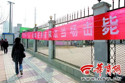 昨日上午10時30分許,記者來到丈八路與朱雀大街路口,遠遠就看到路口的西南角,陜西扶貧技術(shù)學(xué)院南校區(qū)圍墻外,掛著紅底白字的醒目橫幅。上面的內(nèi)容是“嚴打‘兩搶一盜’搶劫拒捕者依法當(dāng)場擊斃”。落款是“長延堡派出所”。