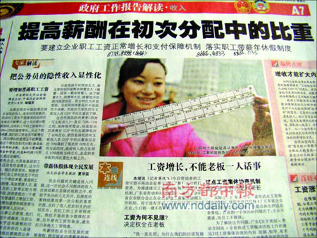 這張個稅為0的工資條圖片源于3月6日廣州一家報紙。當時正值全國“兩會”,企業(yè)職工薪酬問題受到了人們的普遍關注,而且從今年3月份開始,個人所得稅的起征點由1600元調整到2000元。該報紙以“收入”為關鍵詞在A7版做了半個版的政府工作報告解讀,并特意采用了一張工資條的特寫照片作為插圖,而正是在這張圖里,工資所得者的個人所得稅一欄顯示為0.