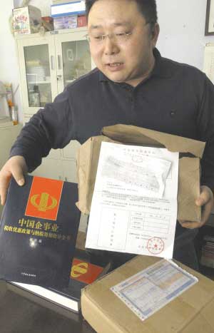 昨日上午,在豐樂五金機(jī)電城東南一消防器材店,商戶胡先生拿出兩本天價(jià)書,滿臉愁苦。這兩本書的書名為《中國(guó)企事業(yè)稅收優(yōu)惠政策與納稅籌劃指導(dǎo)全書》。