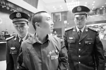 下午3時10分,待法庭書記員宣讀完法庭紀律后,宣判開始了。在三百多雙眼睛的注視下,在上百臺照相機、攝像機的聚焦下,許霆被法警押上了被告席。穿著天看(天河區(qū)看守所)1643號藍色看守服的許霆,臉上還是那么白,還是那么鎮(zhèn)定。法警解開手銬后,他端坐在法庭被告席上,雙手分開緊緊地貼在了膝蓋上。負責(zé)該案的審判長開始宣讀審判書,許霆始終目不轉(zhuǎn)睛地緊盯著他。