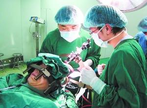 3月21日上午,醫(yī)生給陳先生戴上一個球形坐標定位框,通過探測患者的腦電波,在專業(yè)儀器上給患者的大腦建立一個三維矩陣,“就像衛(wèi)星導航定位一樣,人腦中的每一個部位就都具有了一個明確的坐標”。之后,醫(yī)生又對患者的大腦進行薄層高清晰度掃描,進一步顯示患者腦內的各種結構。然后利用這種掃描的圖像,根據(jù)醫(yī)生的臨床經(jīng)驗,從解剖結構上確認患者大腦內需要安放電極核塊的靶點坐標。