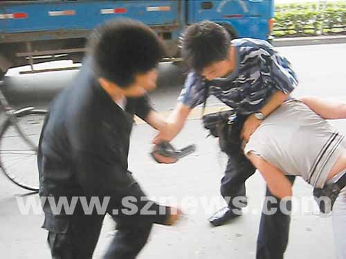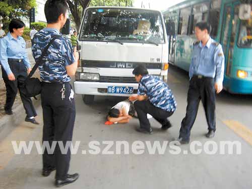 前天下午5時(shí),南頭街道綜合執(zhí)法隊(duì)在南頭古城東門口例行巡查時(shí),發(fā)現(xiàn)多個(gè)小攤販占道經(jīng)營。見到執(zhí)法人員從車內(nèi)走出來,不少小攤販自覺收起小推車走人。但是,一名賣菠蘿的女?dāng)傌溡姷綀?zhí)法人員后,仍然我行我素。執(zhí)法人員只好將其小三輪車暫扣下來。但女?dāng)傌溡幌伦鱼@入執(zhí)法車下面不肯出來。一名執(zhí)法人員去拉她出來的時(shí)候,被她抓傷。女?dāng)傌溸聲稱,“你們不讓我擺攤,我就不讓你們好過!”。