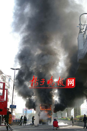 昨天上午7時(shí)55分,一輛雙層100路公交車在南京市雨花西路高架橋沿線尾部發(fā)生自燃,濃煙升騰數(shù)十米。時(shí)值上班高峰,公交車內(nèi)有乘客60多位。一騎車上班的市民發(fā)現(xiàn)火情后,奮追100多米,向駕駛員通報(bào)火情,隨即司機(jī)停車并及時(shí)疏導(dǎo)乘客,后因火勢太大,公交車瞬間成了“火”車,還危及地鐵中華門站10多米高正在運(yùn)行的地鐵線。隨即,消防官兵趕到現(xiàn)場,撲救大火。整個(gè)過程中,沒有乘客受傷。但是大火將公交車燒成了一個(gè)空殼,烤化了附近的店家門面招牌,熏黑了地鐵柵欄,道路旁的植物也被烤死。