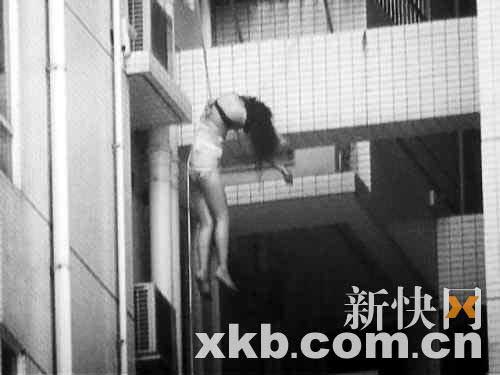 本月6日上午7時,東風東路東風廣場內(nèi)的清潔公司蕭姓女工第一個目睹了懸掛在該樓橫梁上的女尸。據(jù)當時媒體公布的圖片,死者身上半裸,除了內(nèi)衣內(nèi)褲外再沒有穿其他衣物,更為恐怖的是,其尸體竟然懸掛在該廣場麗豪閣T7棟12樓和13樓之間。