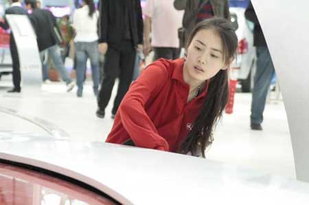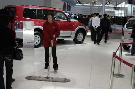 接下來的事情讓攝影者幾乎落淚:清潔妹妹在為輪胎拋光,當(dāng)時(shí)展臺(tái)上的模特正在走秀,臺(tái)下很多專業(yè)的攝影家們?cè)谕业嘏臄z著,她蹲著從底下擦過來的時(shí)候,似乎阻擋了他們的創(chuàng)作,一個(gè)攝影家為了捕捉到那珍貴的大腿,沖上來,伸出大手拉了她衣服領(lǐng)子一下,她趔趄了一下,然后很不好意思地躲開了,從照片上看,妹妹仍然盡職地擦著車,但緊閉的雙眼、微蹙的眉頭讓人能一眼看出,她心里很不好受,這張楚楚可憐的照片,令人對(duì)其頓生同情和憐愛。