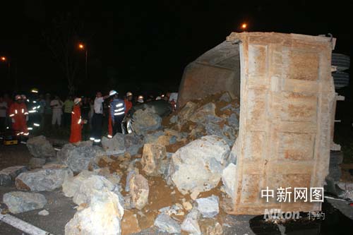 在事故現(xiàn)場(chǎng),記者看到一輛滿載石頭的工程車側(cè)翻壓在一輛面包車上,地面撒滿了玻璃碎片和石頭,面包車嚴(yán)重變形,2名人員被困,其中一名女子經(jīng)現(xiàn)場(chǎng)救護(hù)人員診斷稱由于失血過(guò)多已死亡,另一名被困人員被壓在了工程車下面,不能動(dòng)彈,生命垂危。