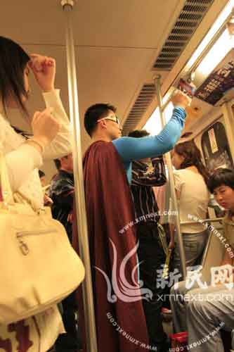 據(jù)新民網(wǎng)了解,網(wǎng)友yinzeqing在SJTUNews討論區(qū)所發(fā)表一則帖子被各大論壇轉(zhuǎn)載,引起網(wǎng)友極大興趣。該帖子主要內(nèi)容為一組在地鐵一號(hào)線拍到的“超人”照片。圖片里有一個(gè)男子批紅色斗篷、穿藍(lán)色緊身衣、內(nèi)褲外穿,戴著墨鏡大搖大擺乘起了地鐵。