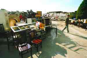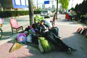 昨日下午3時(shí)30分許,修建中的地鐵十號(hào)線太陽(yáng)宮站東北側(cè),冰箱、啤酒箱、柜子、煤氣罐、桌子及一百多張椅子堆放在人行道上,幾名青年男女正倚靠著堆在樹(shù)邊的被褥打盹。他們工作的飯店原本有約3000平方米,如今卻成為一片廢墟。