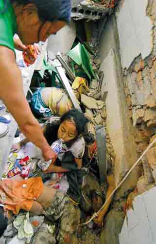 在這里,一名親見女兒身體卻拉不出來的母親在哭泣,記者見證了一個(gè)震撼人心的場面:一、二層間還存在一個(gè)不到一米的夾層,一名穿綠衣的高中女孩已經(jīng)爬出,返身去拉那名也已大半個(gè)身子爬了出來的那名母親的女兒,此時(shí)夾層房梁塌下來,二名女孩保持著返身救人和伸手待救的姿態(tài),被砸在了主梁下面,她們離生其實(shí)只差半步之遙。