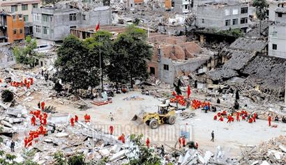 12日14時28分,平武縣南壩小學(xué),伴隨著巨大的轟鳴聲,地面突然開始劇烈搖晃,文具盒、書本從書桌上彈了下來。孩子們蜂擁著往樓下跑。地面的搖晃愈加劇烈,教學(xué)樓“轟”的一聲全部倒塌,800余名師生無一幸免,全被壓在廢墟下面。此刻,小鎮(zhèn)的房子也成片倒塌,老街的平房瞬間變成一堆廢墟,無數(shù)正在趕場的民眾被破碎的建筑掩埋。一個常住人口近萬人的小鎮(zhèn),瞬間被夷為平地。